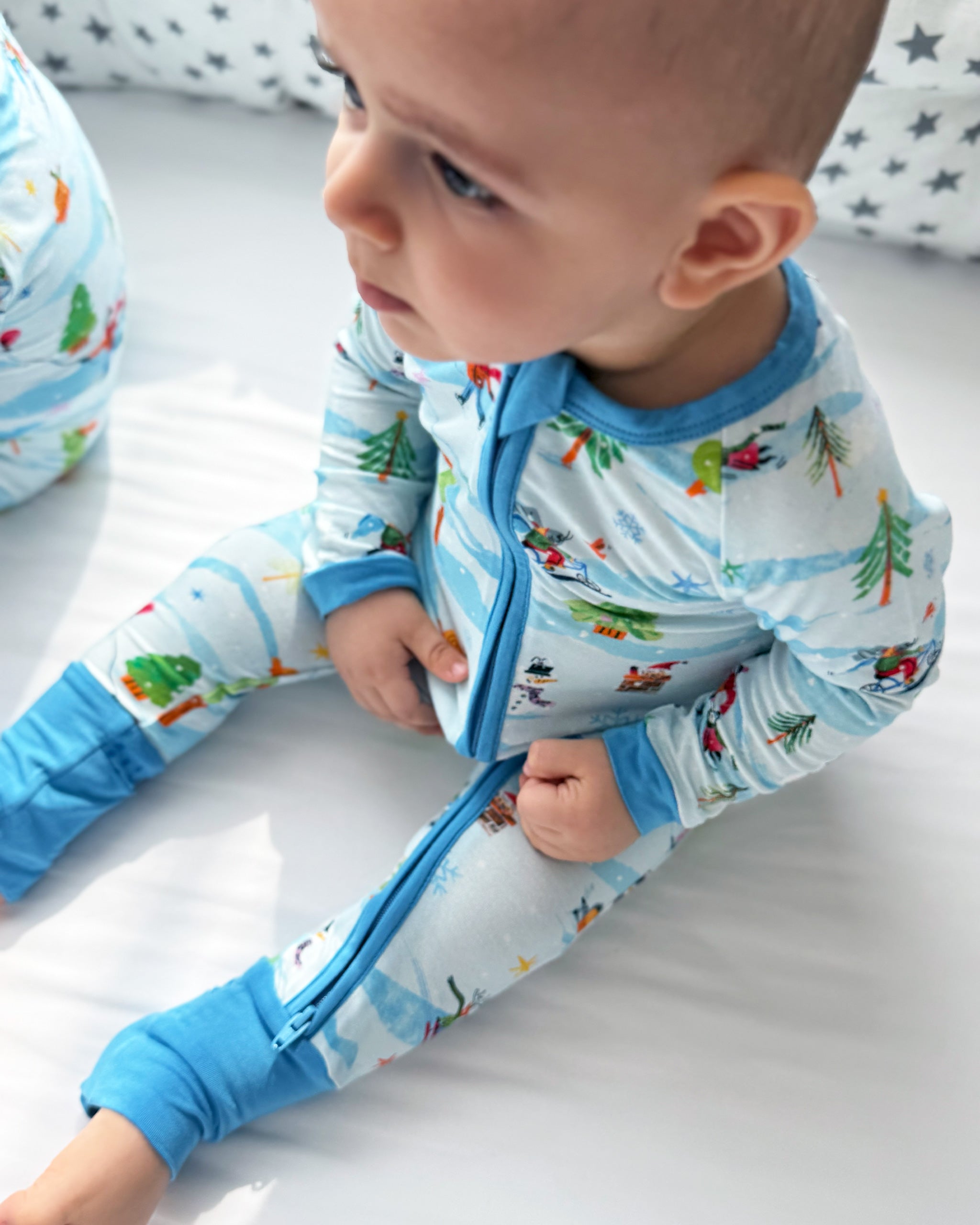 Featuring our whimsical Winter Wonderland print, a snowy blue landscape filled with tiny skiers, snowball fights, Santa and many tiny stories to discover, it’s the latest addition to our matching sibling Christmas Pajama Collection.