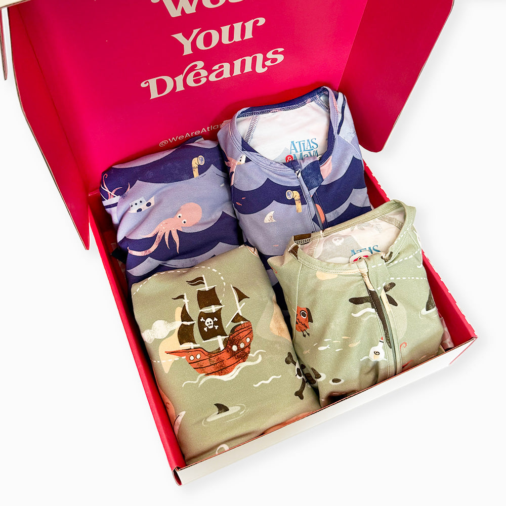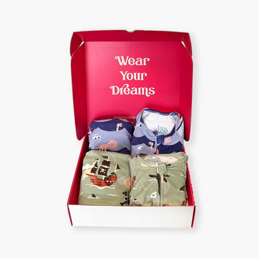 Drift into sweet dreams with The Dreamland Set by Atlas & Maya. This beautifully curated baby gift box features two luxuriously soft Sleepy Time Pajama sleepsuits paired with two matching multipurpose blankets, crafted from organic, breathable and certified non toxic bamboo. Designed to wrap little ones in cozy comfort, the Dreamland Set is the perfect gift for baby showers, first birthdays, or any special moment where sleep, snuggles, and style matter most.