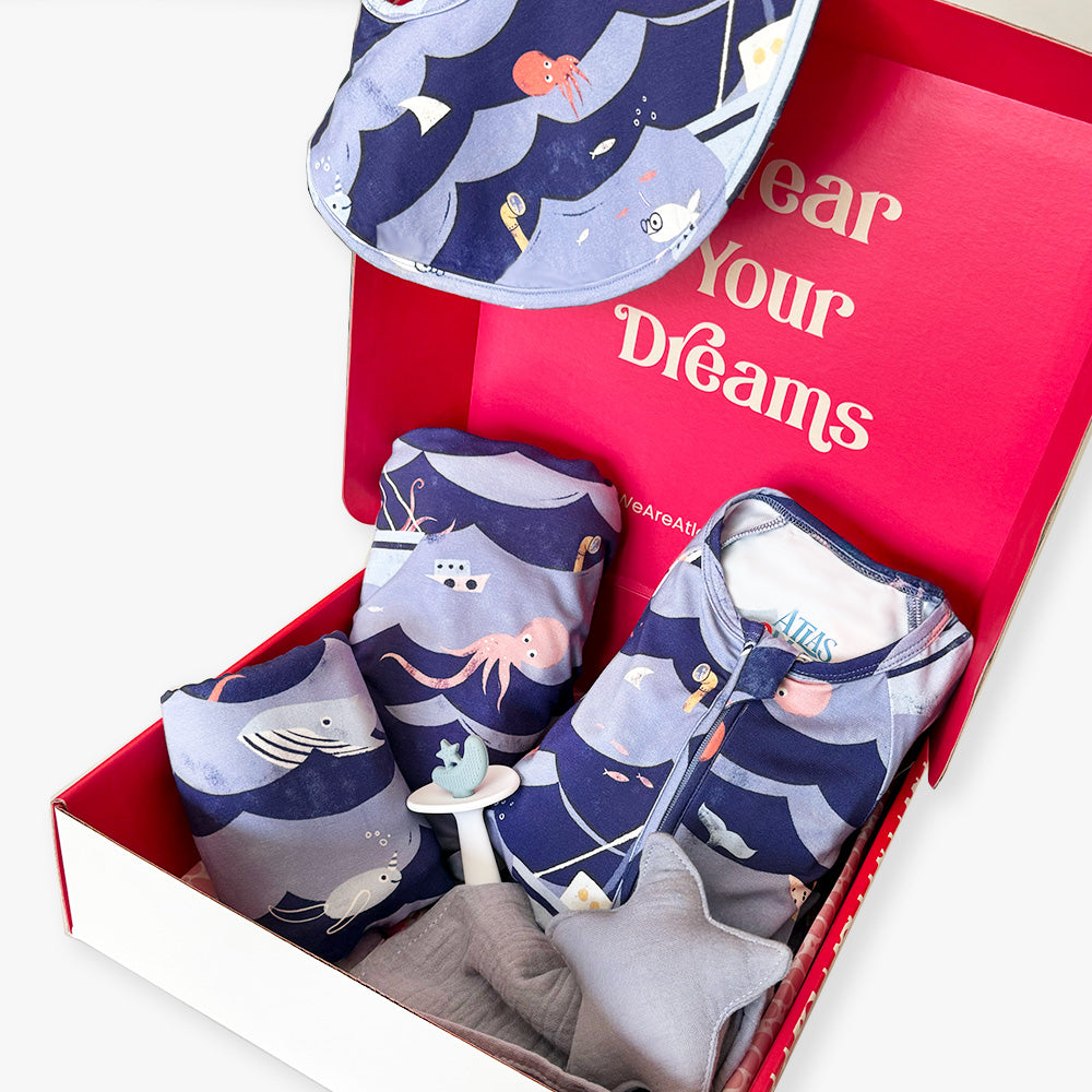 Welcome little ones into the world with The Essential Set by Atlas & Maya. This beautifully curated baby gift box includes a premium organic bamboo sleepsuit, a buttery-soft multipurpose blanket for swaddling or covering, a magnetic round bib, a burp cloth, a moon-shaped teether, and a plush lovey comforter.