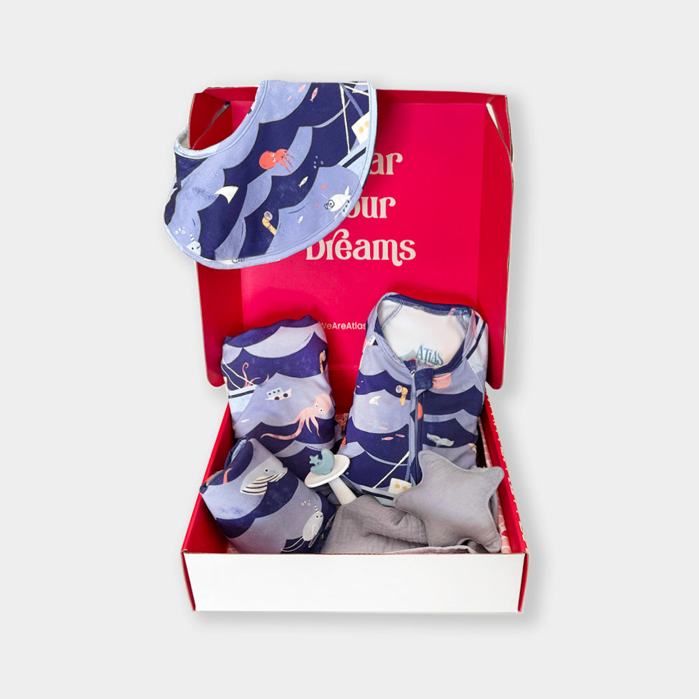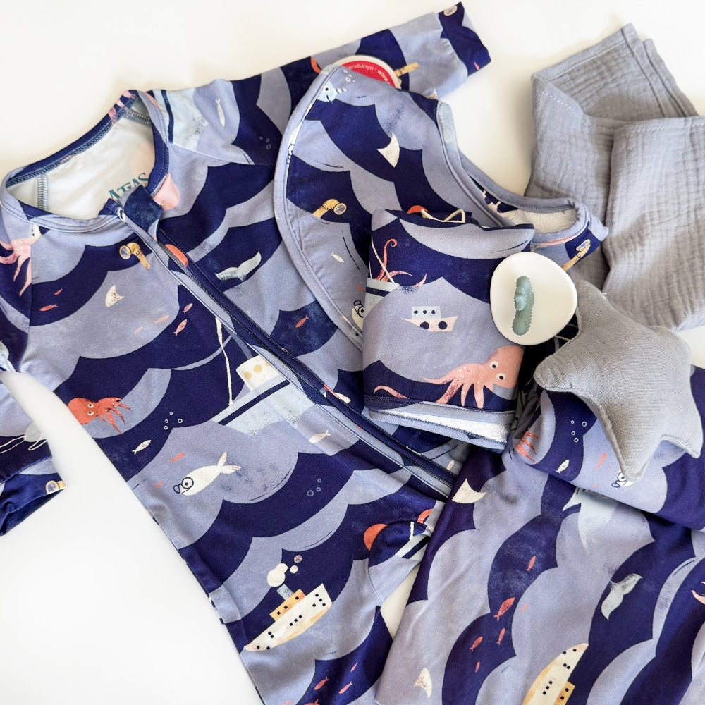 Each set is available in one of our signature prints: Ocean Snuggles, Anchor Away, Mermaid Love, or Pirate Bay, perfect for sparking imagination from the very start.