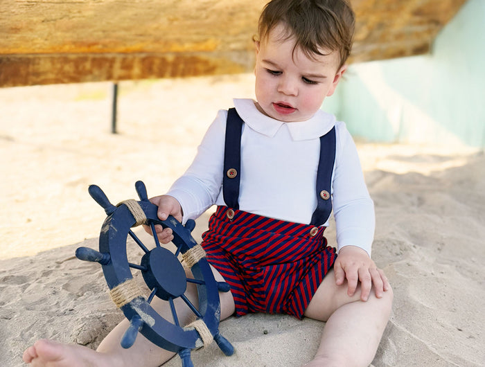 A set that’s equal parts charming and clever. Our crisp white Bermuda collared bodysuit pairs effortlessly with the Ocean Snuggles footie pant. Designed with adjustable straps, a high-rise cut for baby-chic style, and built-in footies that keep little explorers cozy and steady with non-slip grips.