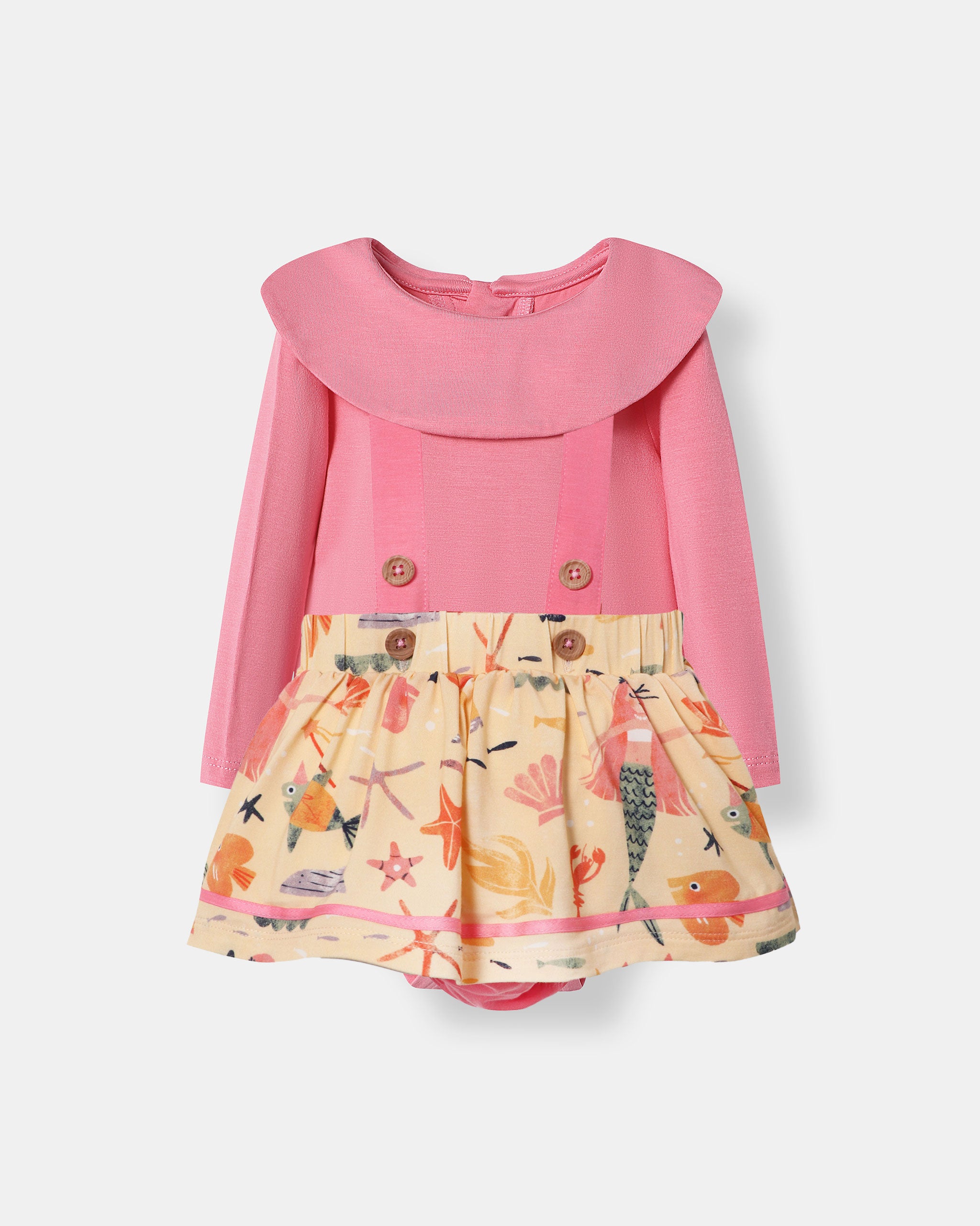 The bubblegum pink Berta bodysuit keeps little ones comfy and tidy while being super easy to dress in with its magnetic closure; the twirl-ready skirt in Mermaid Love adds playful charm.