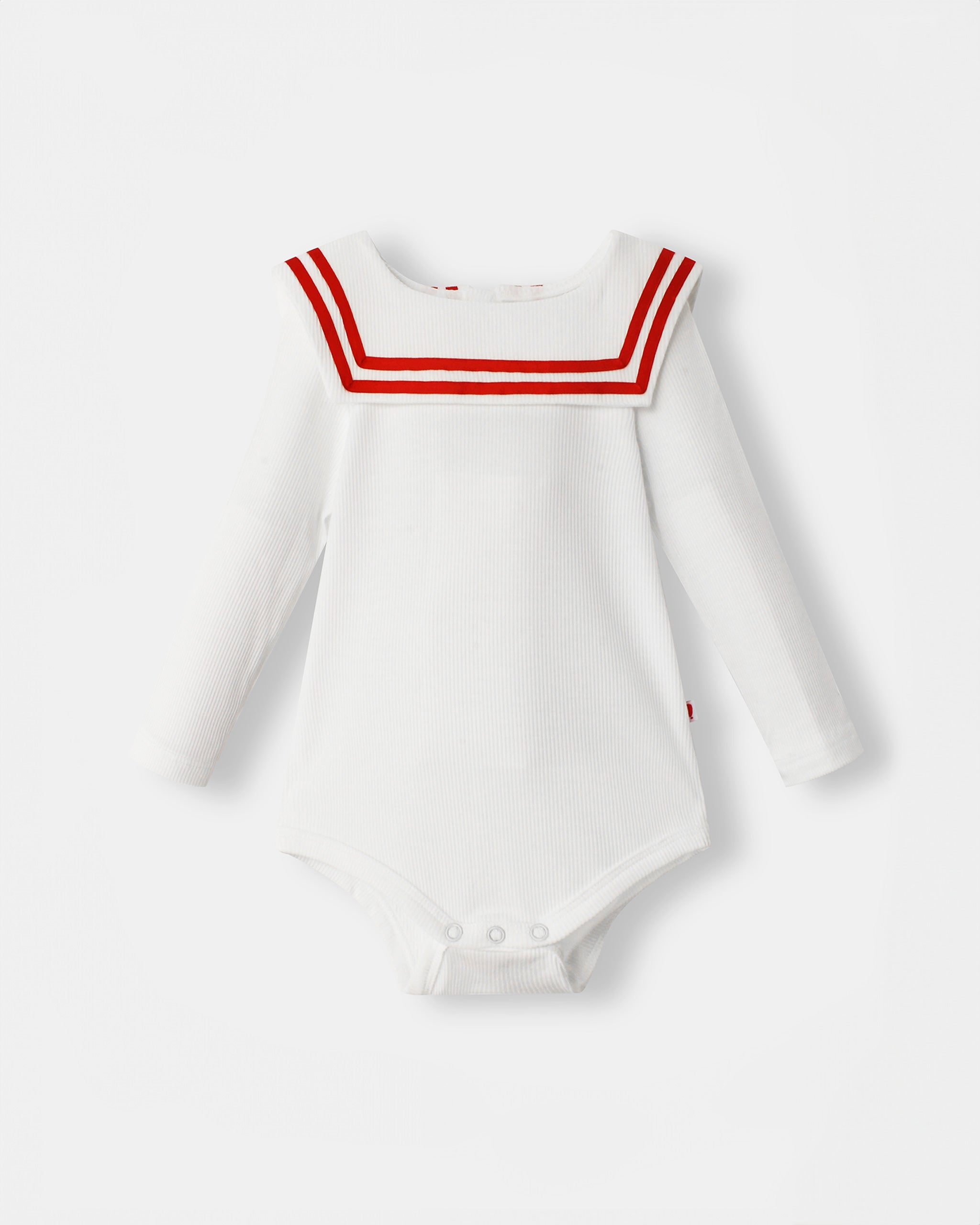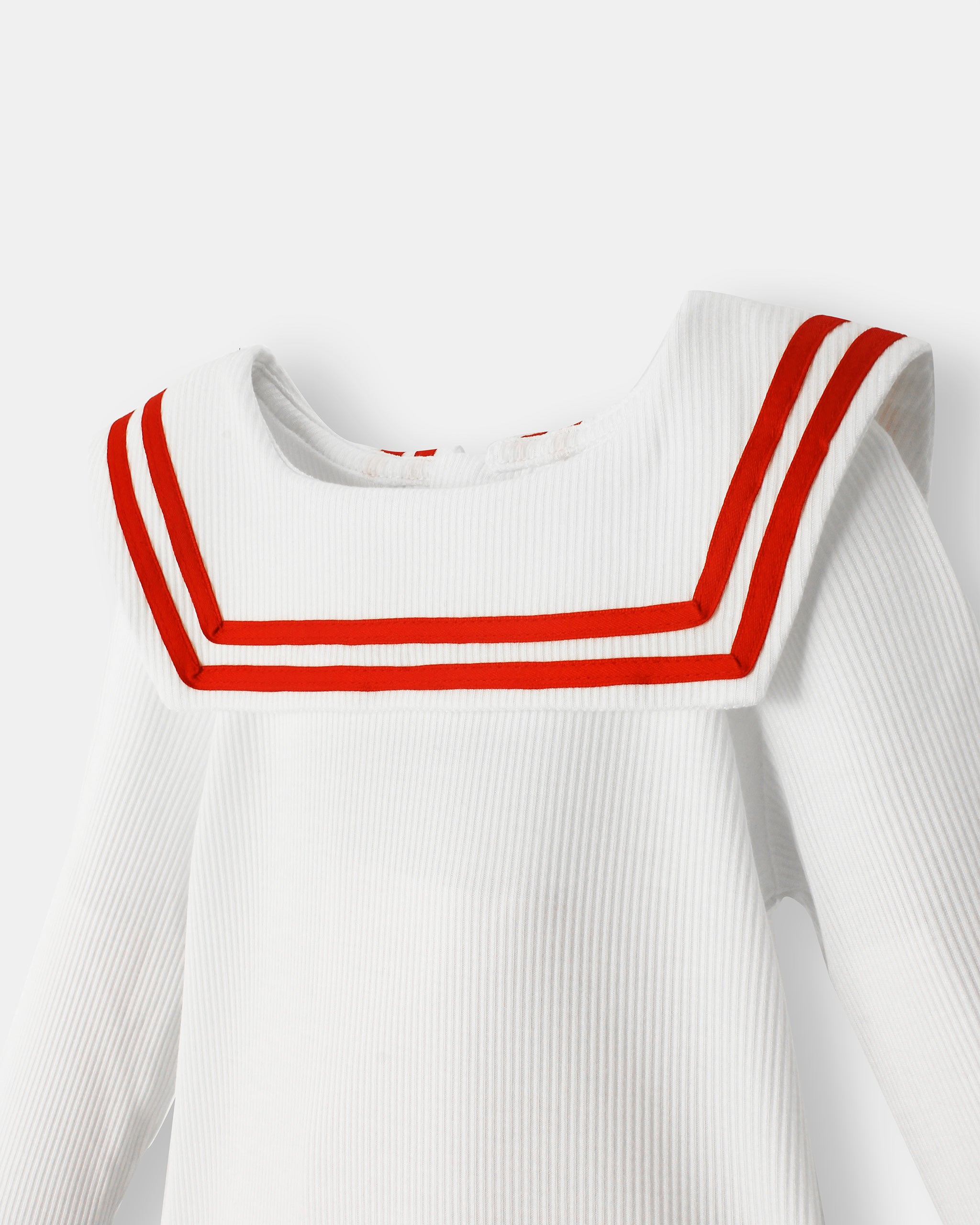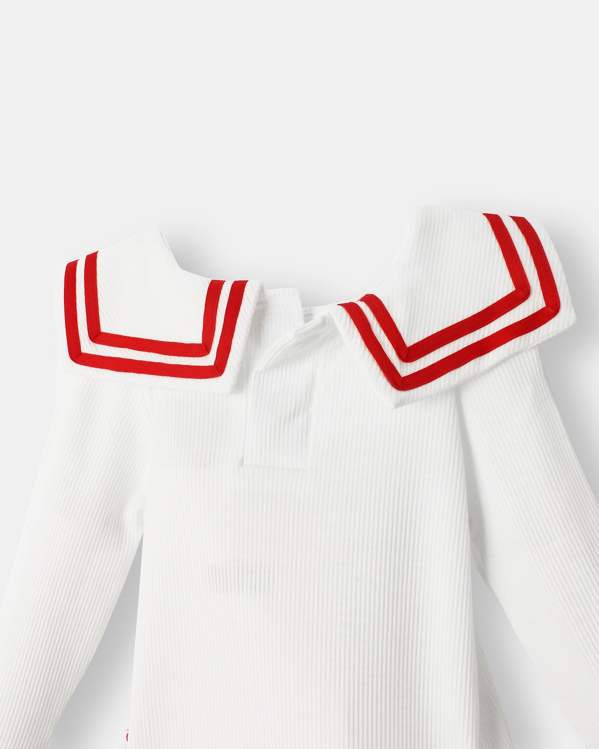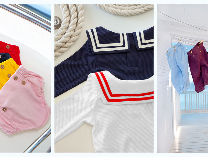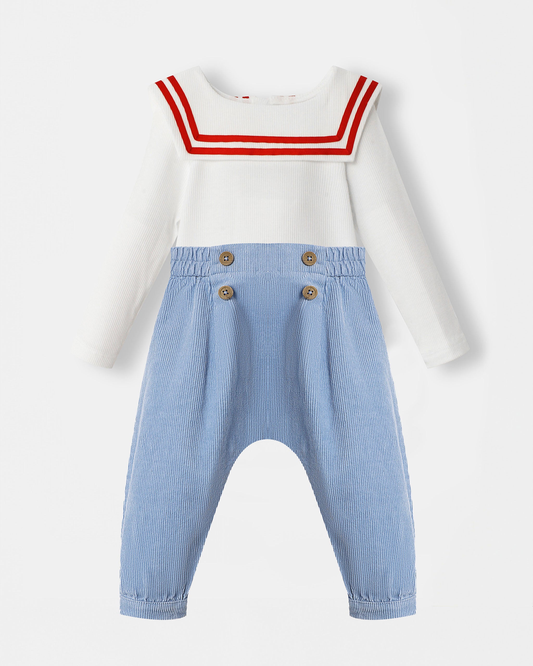 The Nautical Magnetic Bodysuit in white with red trims offers effortless dressing with hidden magnetic fastenings, while the classic Sailor Pant in plush corduroy adds timeless style with sailor button details.