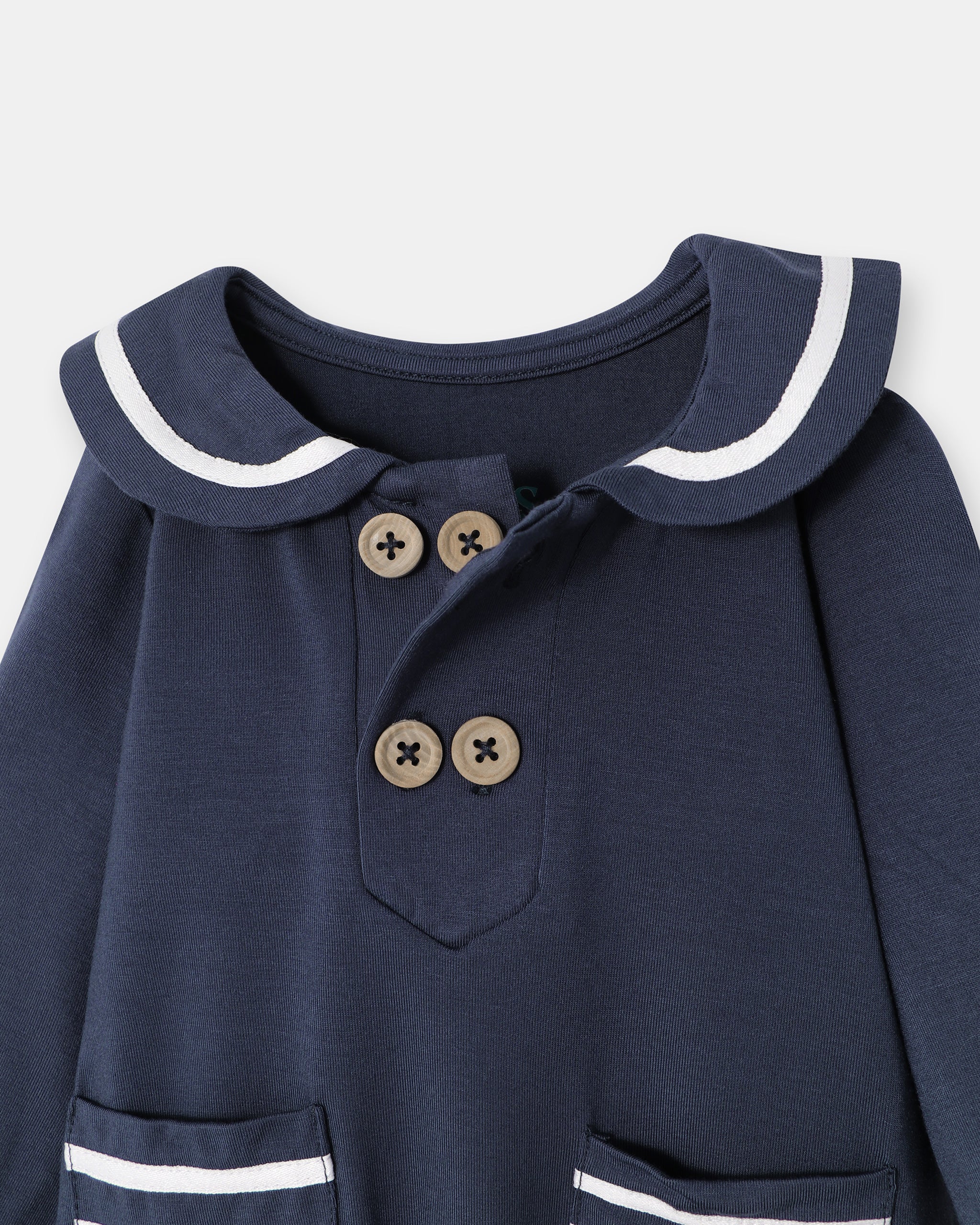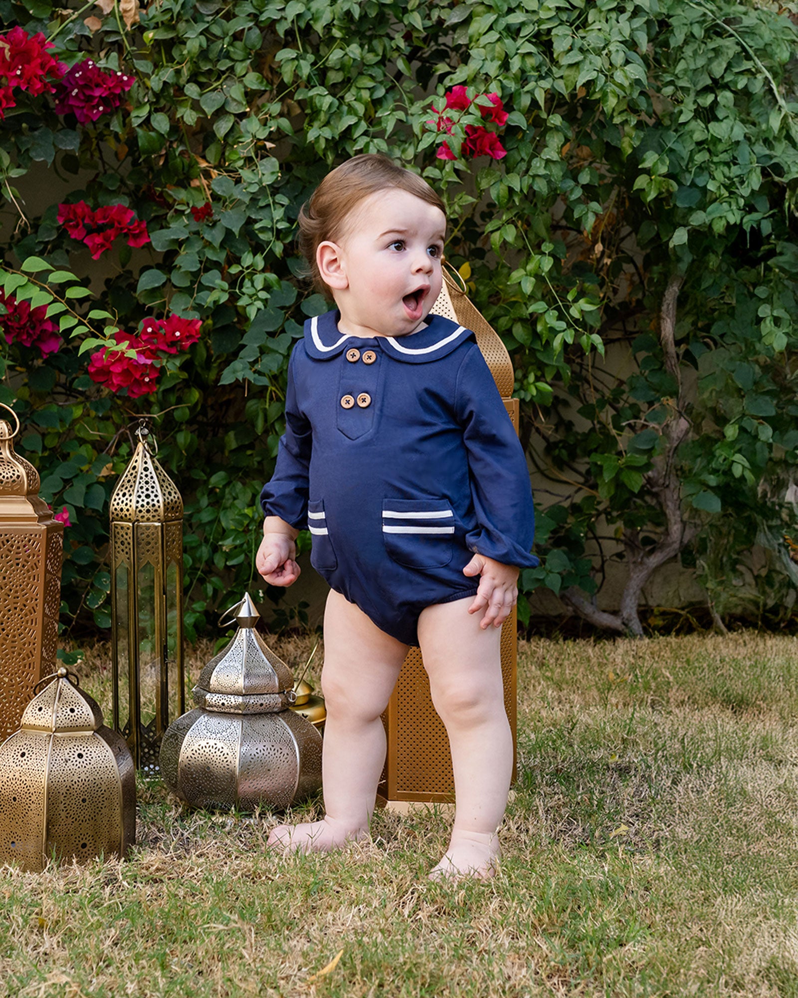 Whether I'm chasing seagulls or dreaming of treasure maps, my First Mate Romper makes every day a high-seas adventure! With its stretchy, comfy fabric, I'm set to navigate through all-day play and never-ending fun. I get to wear this fab romper for playdates and outings, and always get the best compliments.